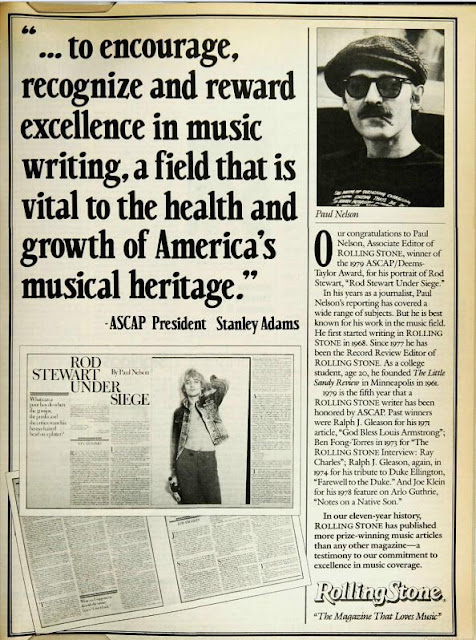 Paul was gone, his office vacated. “Somebody else had to clean it up,” [David] McGee says. “I do remember somebody in there boxing up the records.” Among what was left behind, the Deems Taylor Award presented to Paul by ASCAP in 1979 “in recognition of the excellence of his articles” published in Rolling Stone (for “Rod Stewart Under Siege” in particular). The plaque eventually found its way back to him.